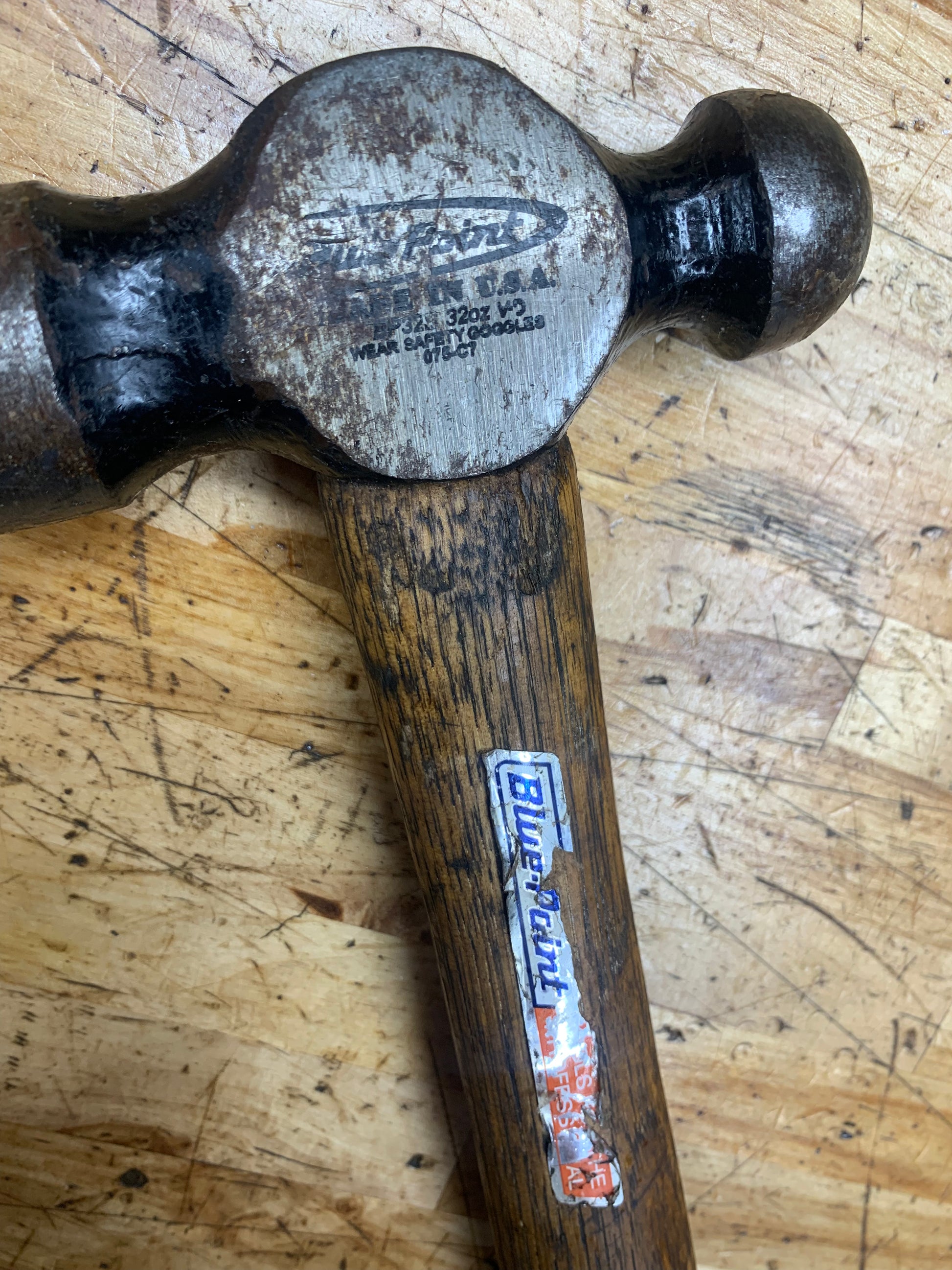 For sale is a Blue Point 32oz ball peen hammer. The hammer shows signs of use, but is in good working order. The hickory handle has held up well.