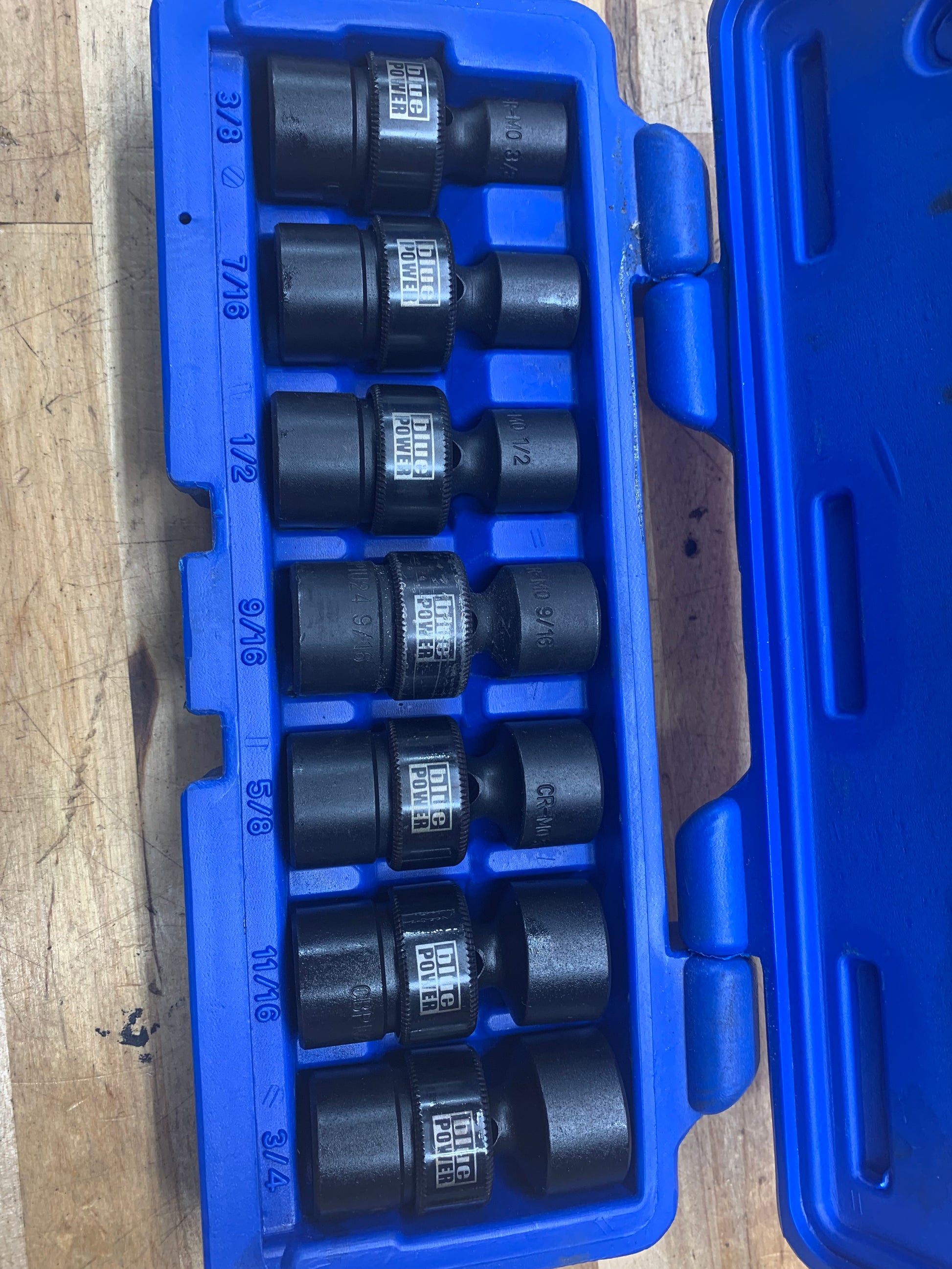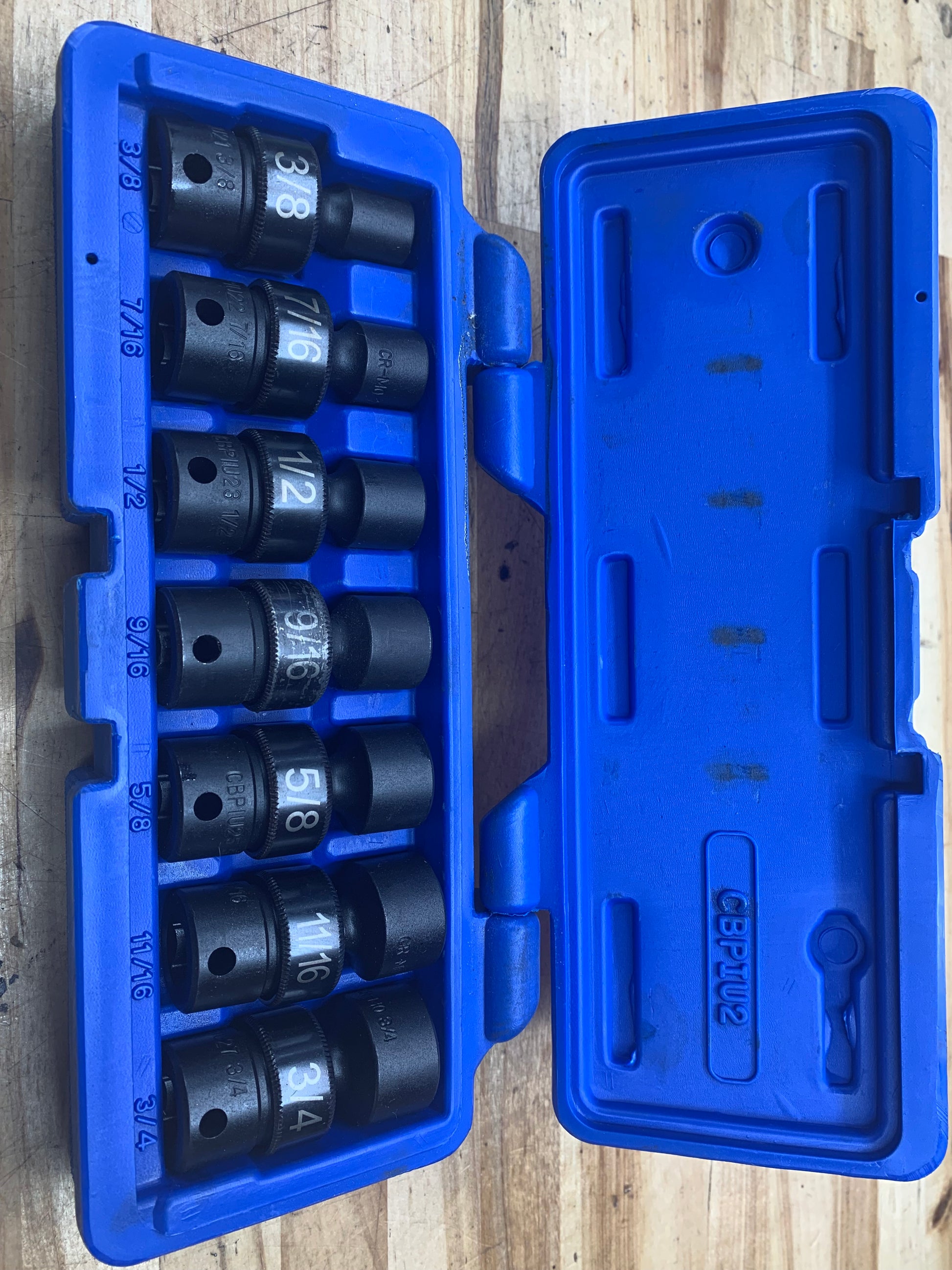 For sale is a set of SAE 3/8”drive impact swivel sockets from Blue Power by Cornwell. Comes with blow mold case.