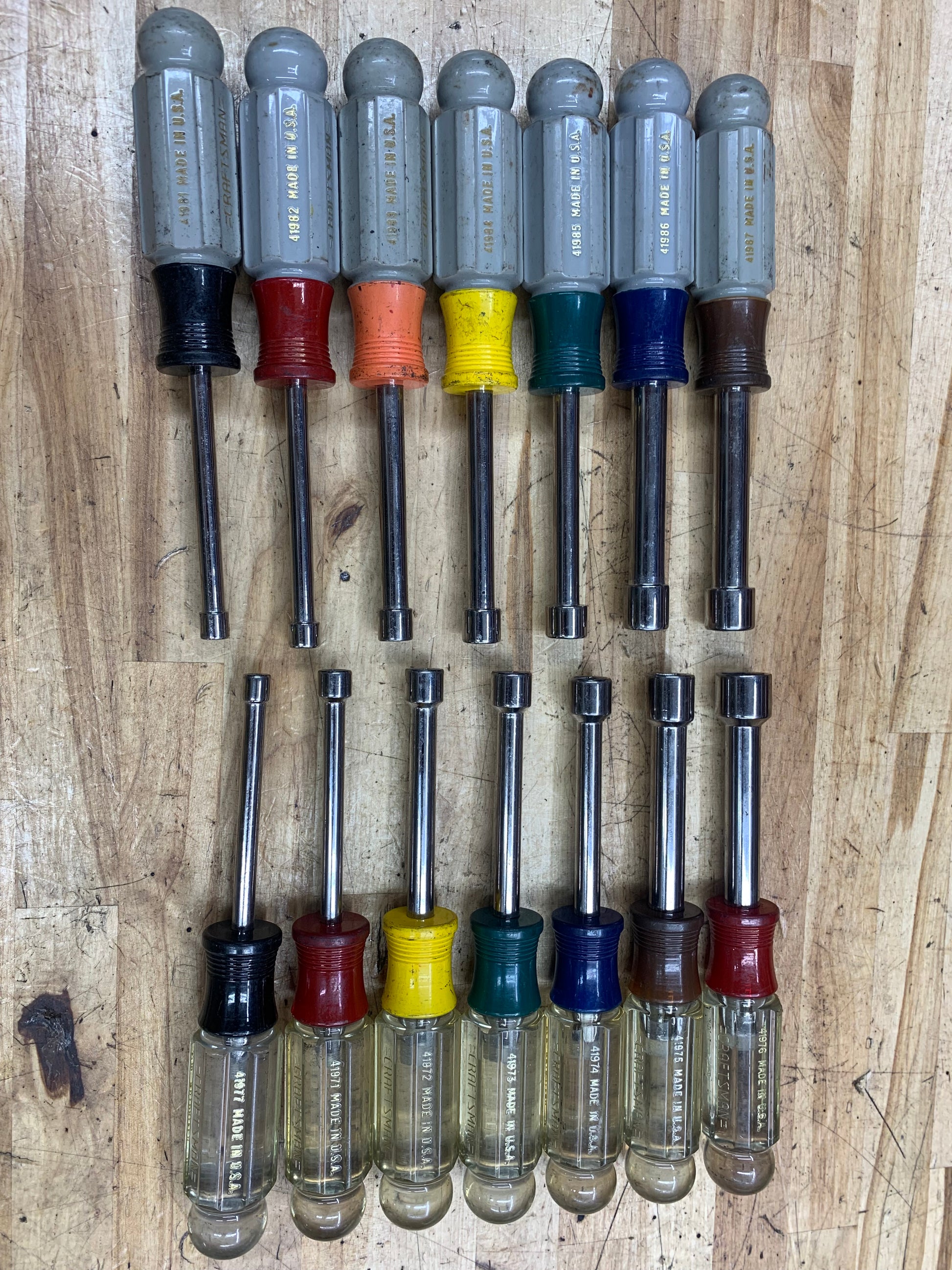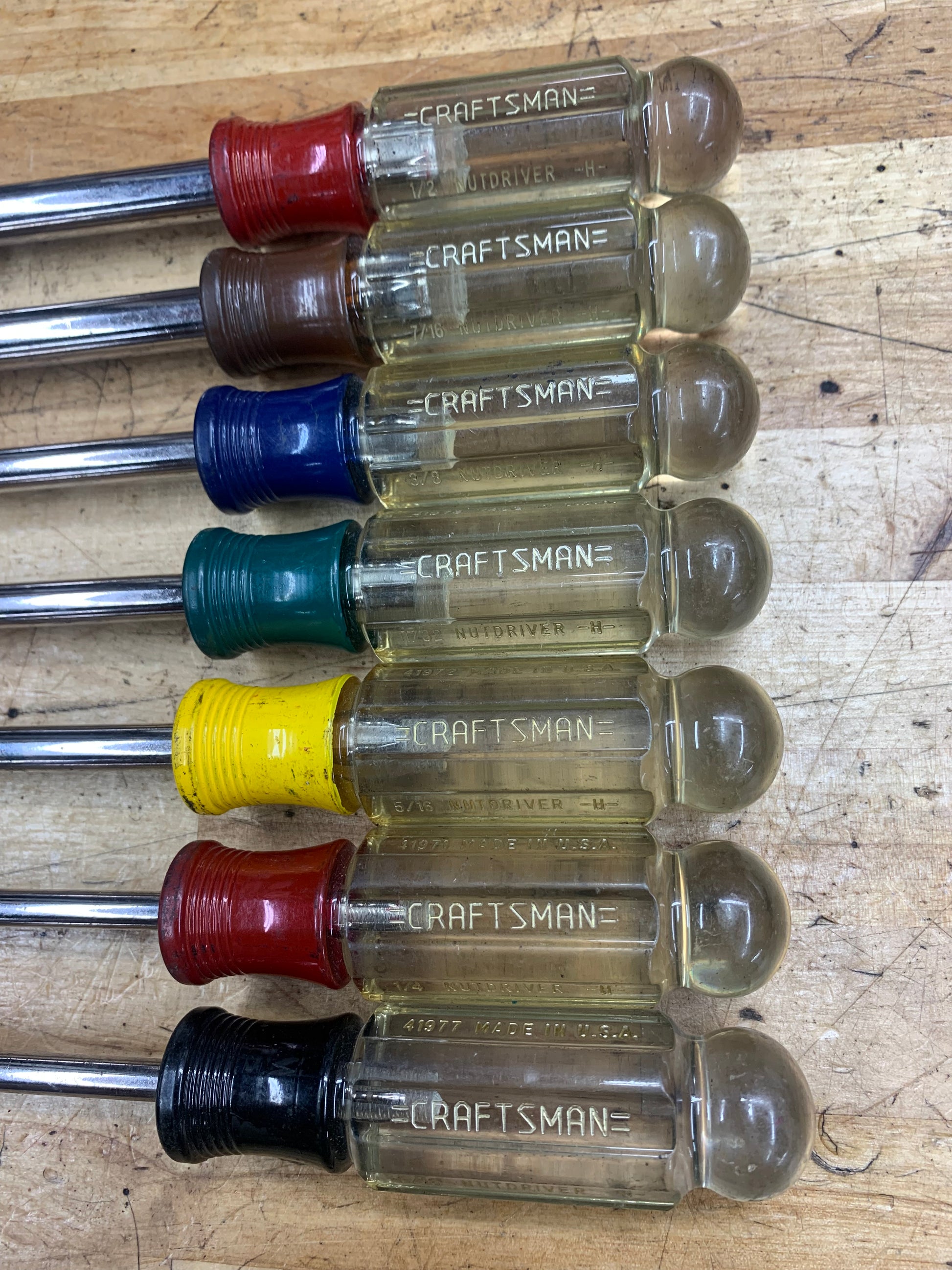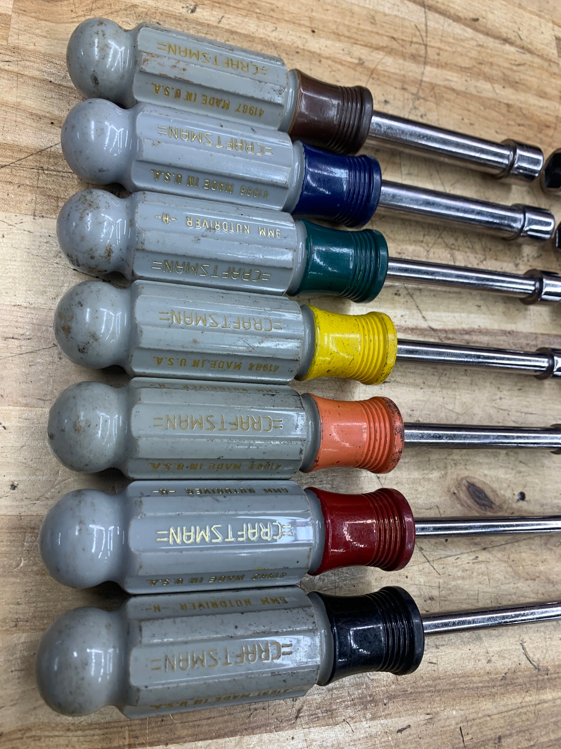 For sale is a vintage set of USA Craftsman nut drivers. 7 metric, and 7 SAE. All drivers are in good used condition. No sizes are skipped.