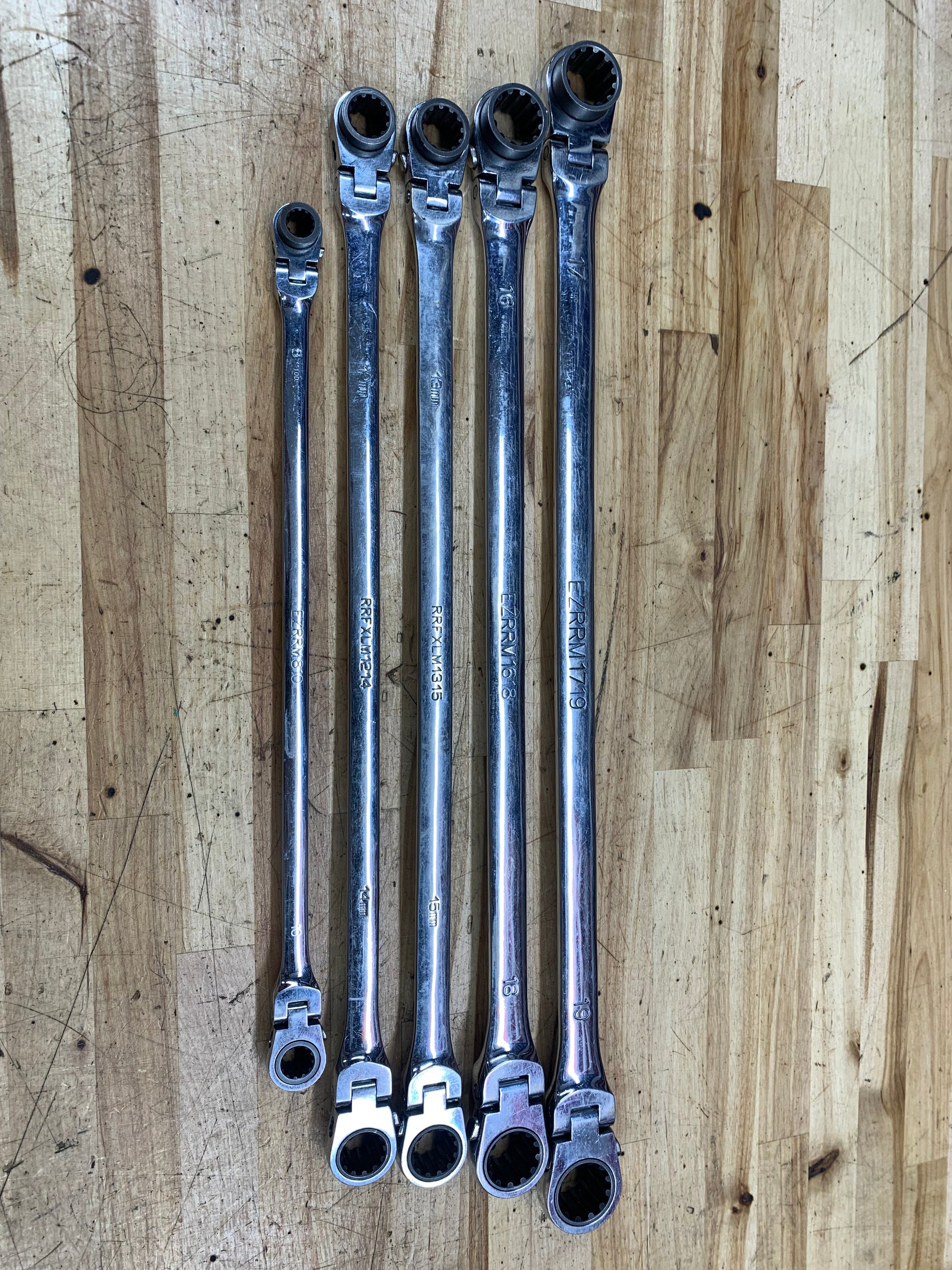 For sale is a set of Metric long flex head ratcheting wrench set 5pc. Sizes 8-19mm.