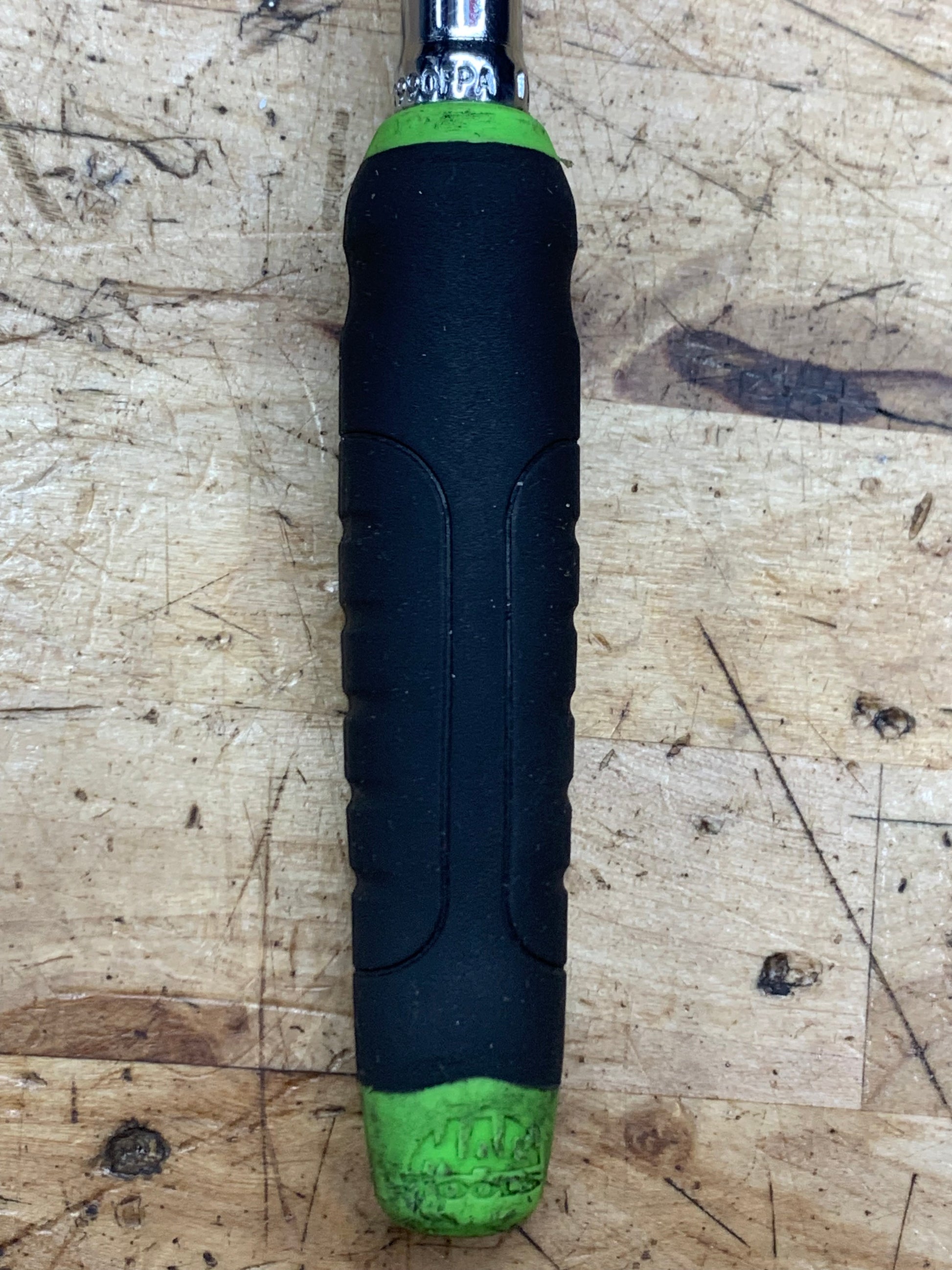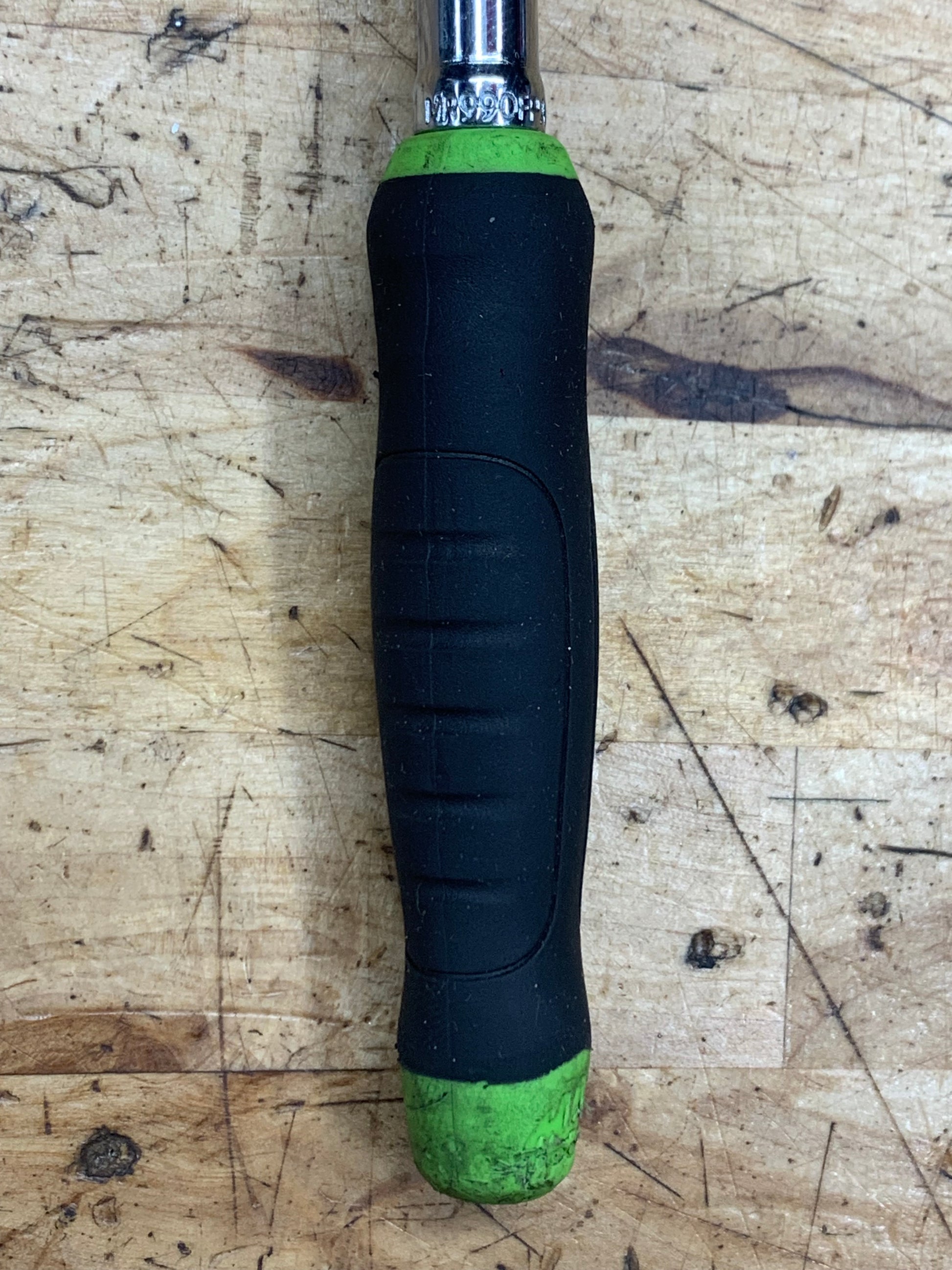 For sale is a Mac Tools 1/4" flex head fine tooth ratchet, with green soft grip. The tool is in good used condition, made in USA.