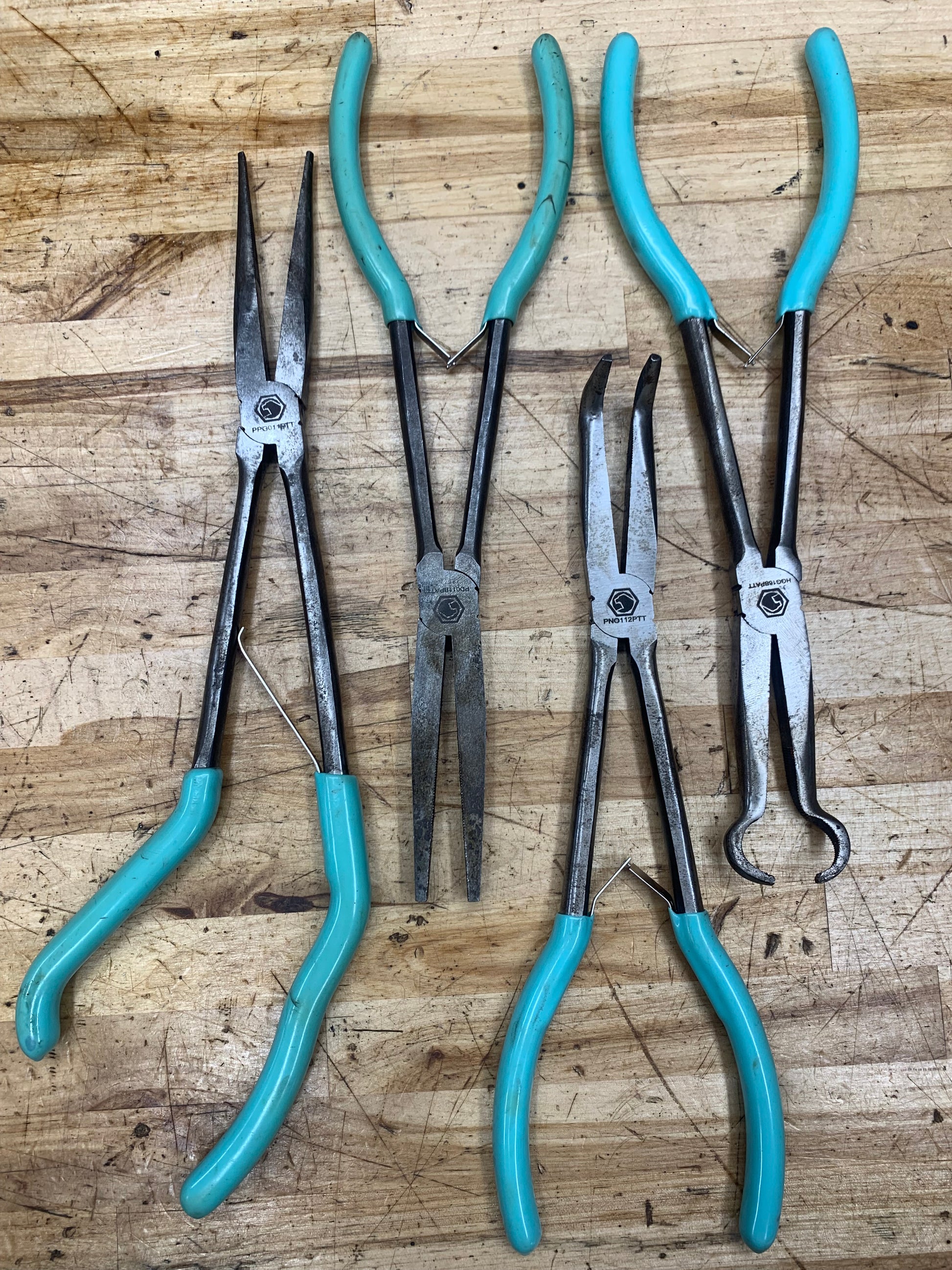 For sale is a 4pc set of Matco long pliers: pistol grip needlenose, hose grip, bent needlenose, and duckbill. The tools are in good used condition.