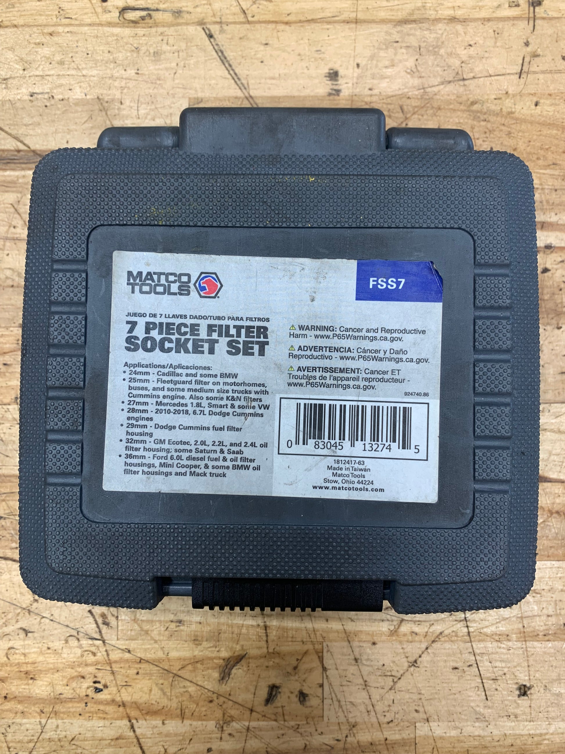 For sale is a Matco 7pc oil filter socket set. The sockets are used, in good condition.