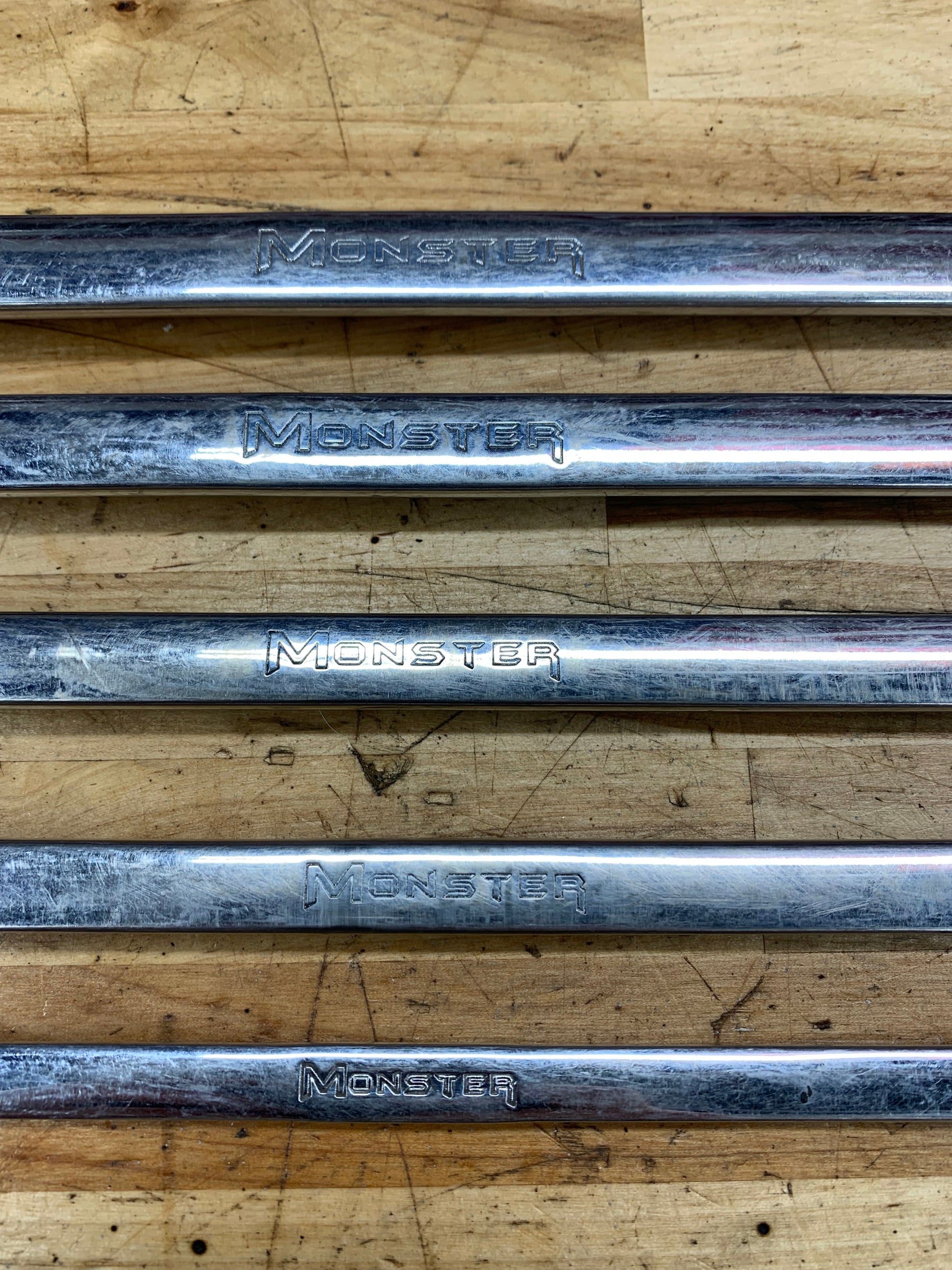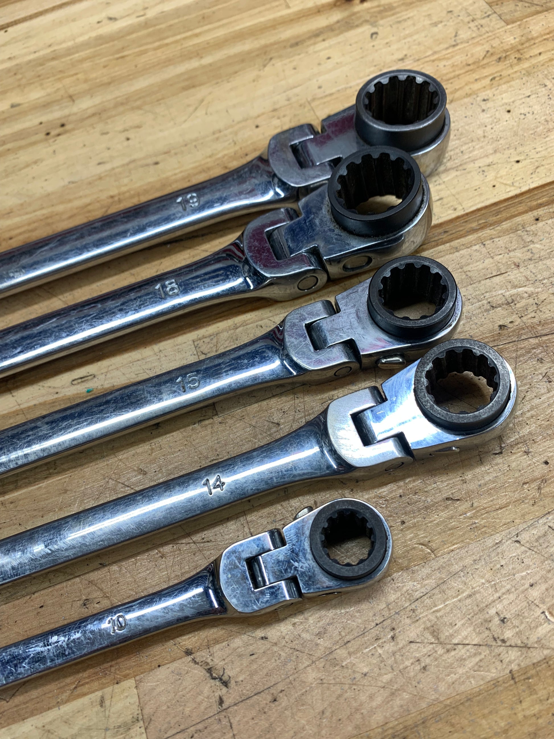 For sale is a Monster brand Metric long flex head ratcheting wrench set 5pc. Sizes 8-19mm.