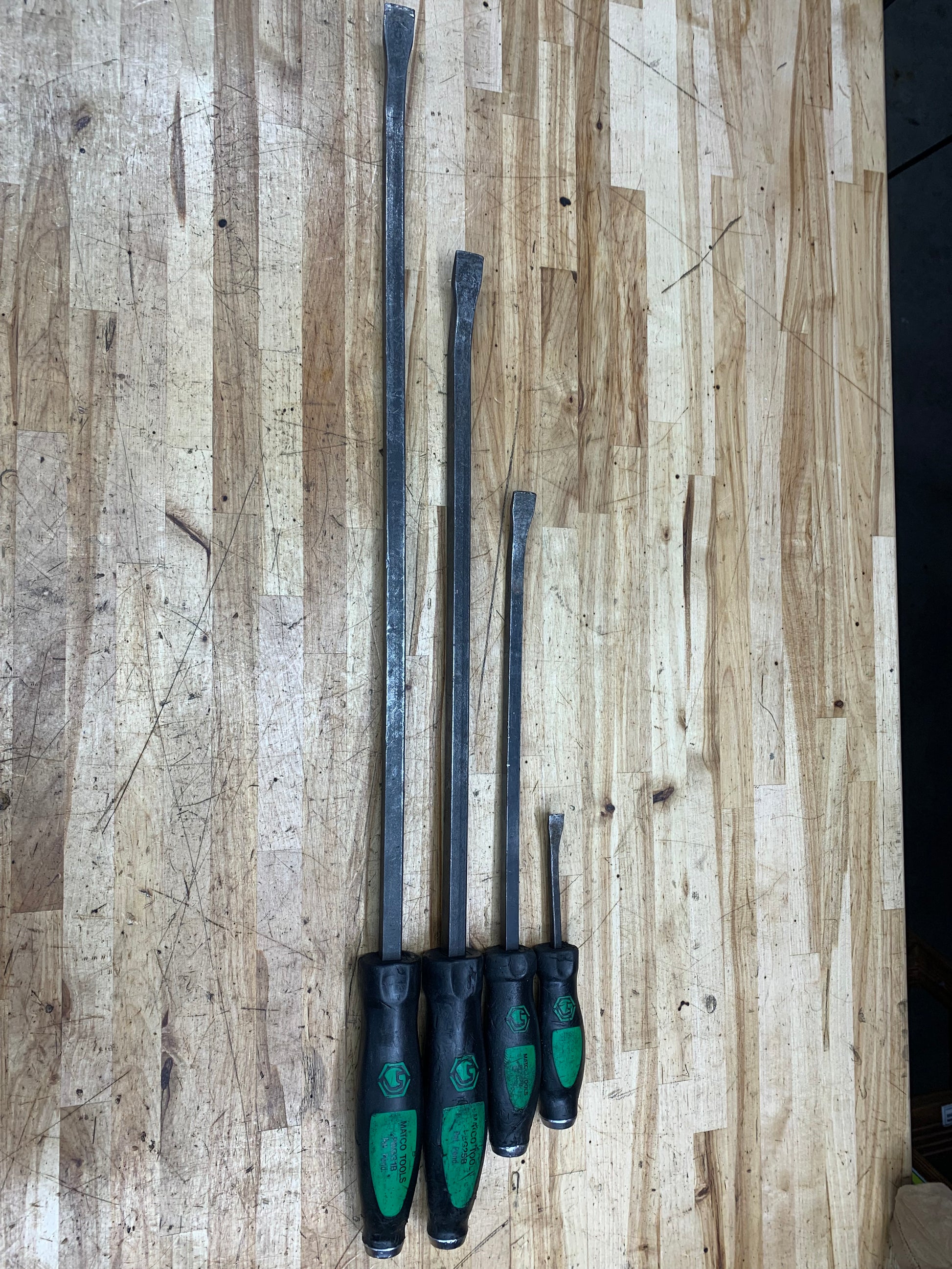 For sale is an extra set of 4 green Matco striking prybars. The tools show signs of use, but work great. The longest prybar is 24”.