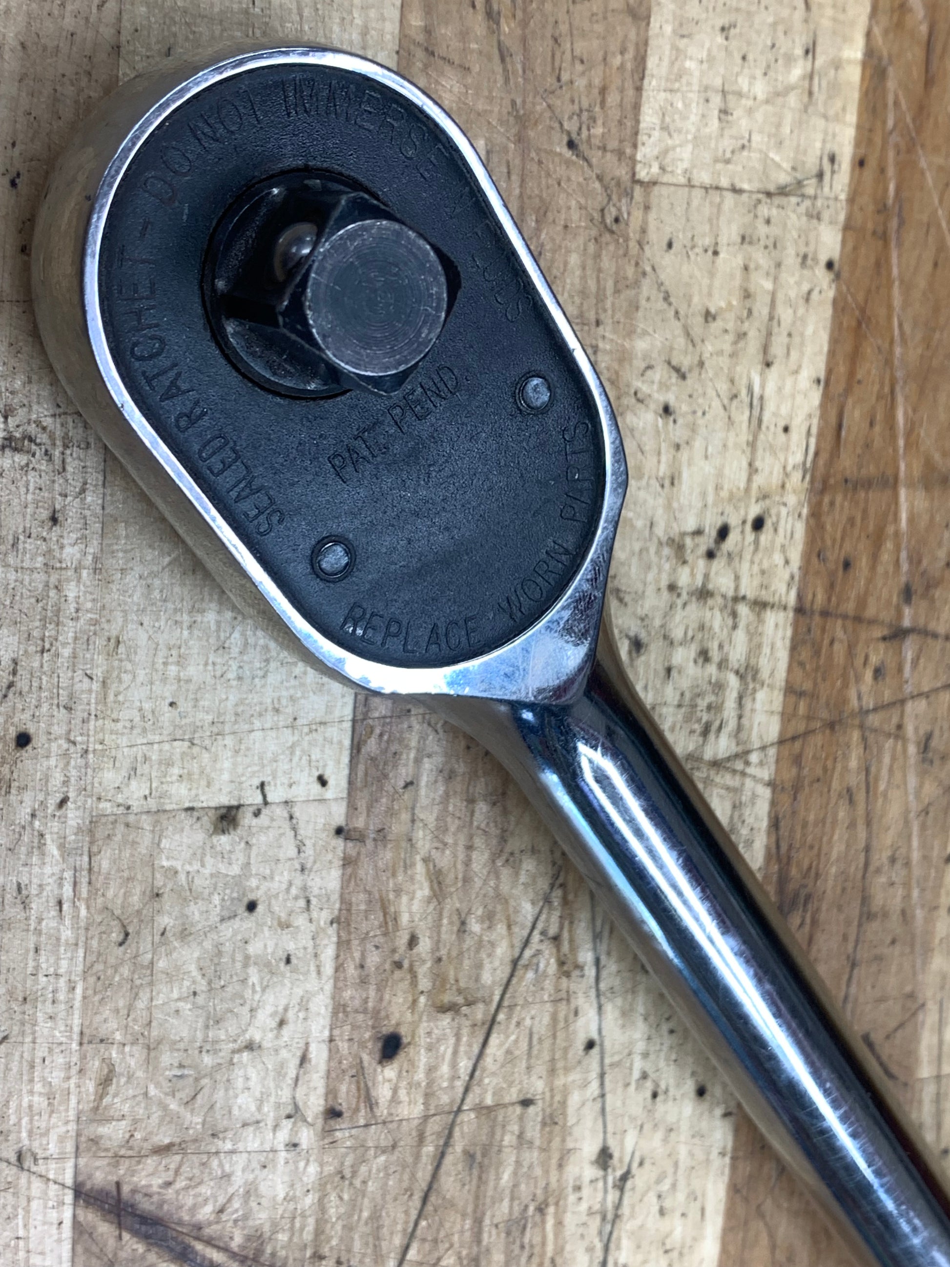 For sale is a Snap On 1/2" long hard handle ratchet. This tool has a custom pink driver handle installed.