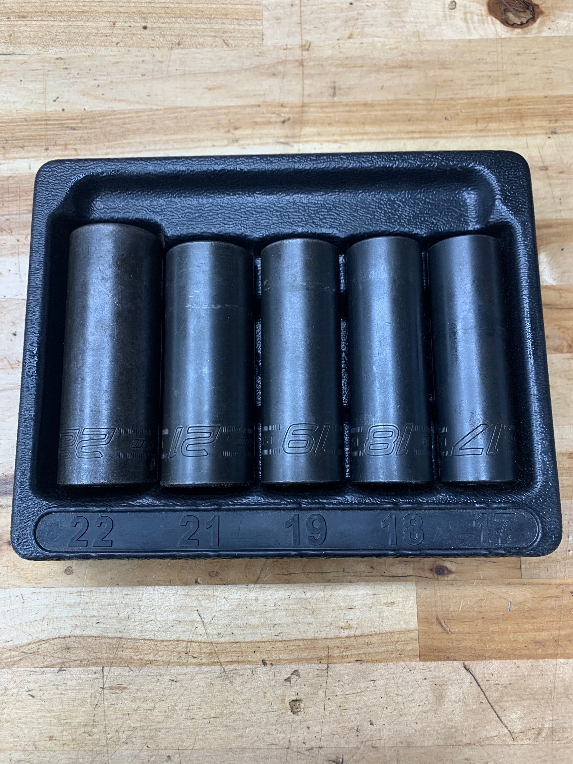 For sale is a 5pc metric set of 1/2" drive deep Snap On sockets, with tray 17-22mm. They are used, in good condition.