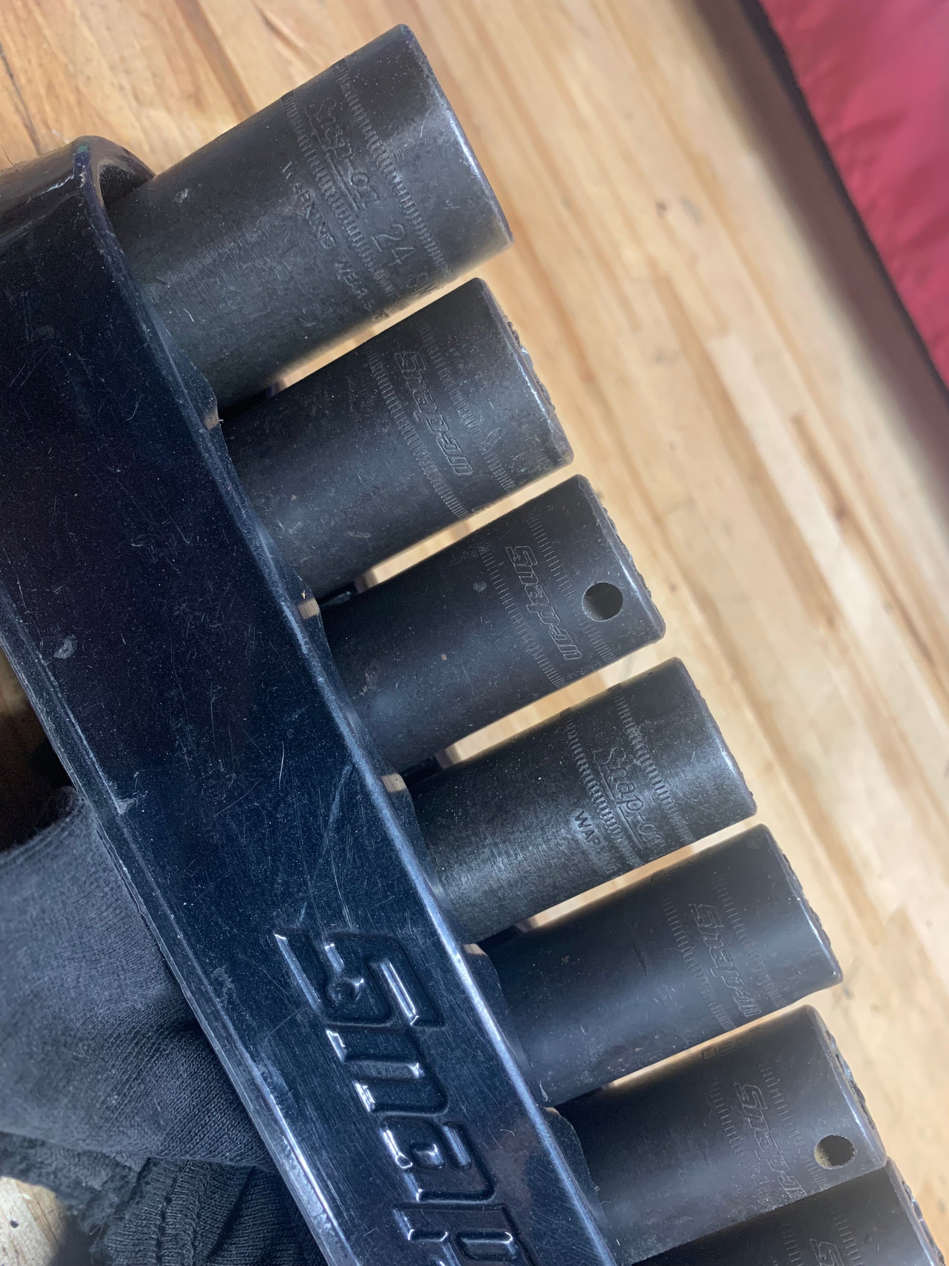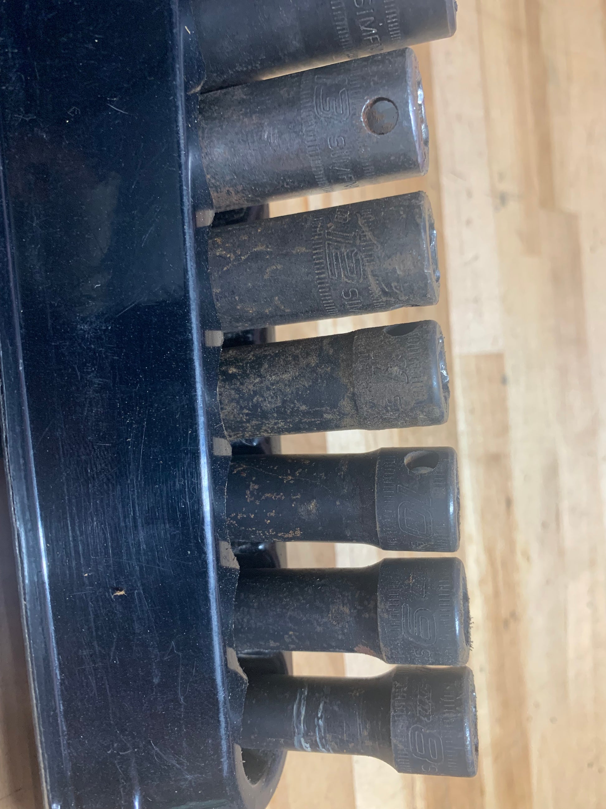 For sale is a Snap On metric socket set 3/8" deep impact, with magnetic tray, 8-24mm. They are used, with signs of light surface rust. Other than that, they're in good used condition.