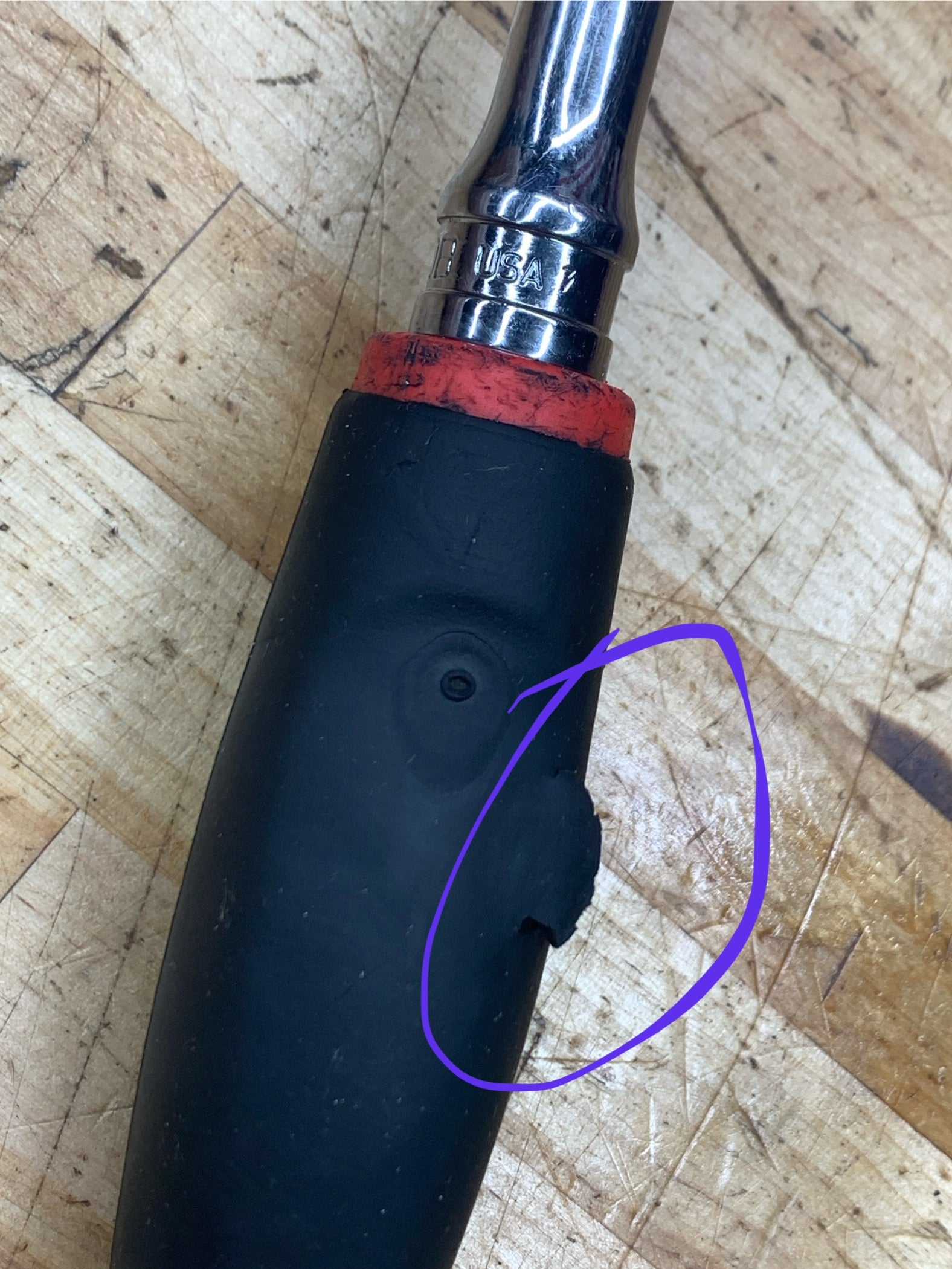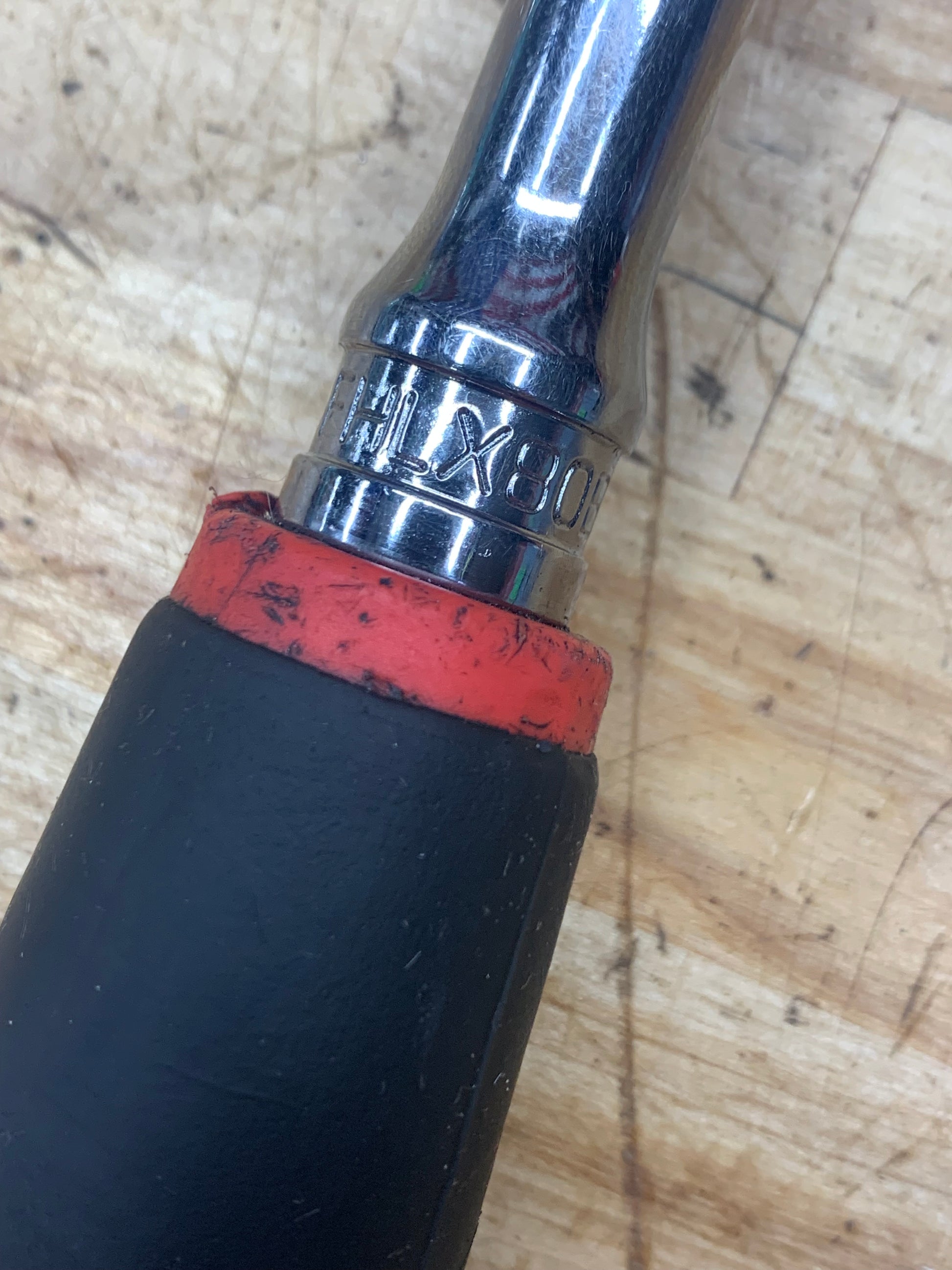 For sale is a Snap On ratchet, 3/8" locking flex head ratchet, soft grip. This is the newer style locking head from Snap On. The tool is in good used condition, with smooth fine tooth ratchet action. The handle does have a nick to rubber, as circled in the picture.