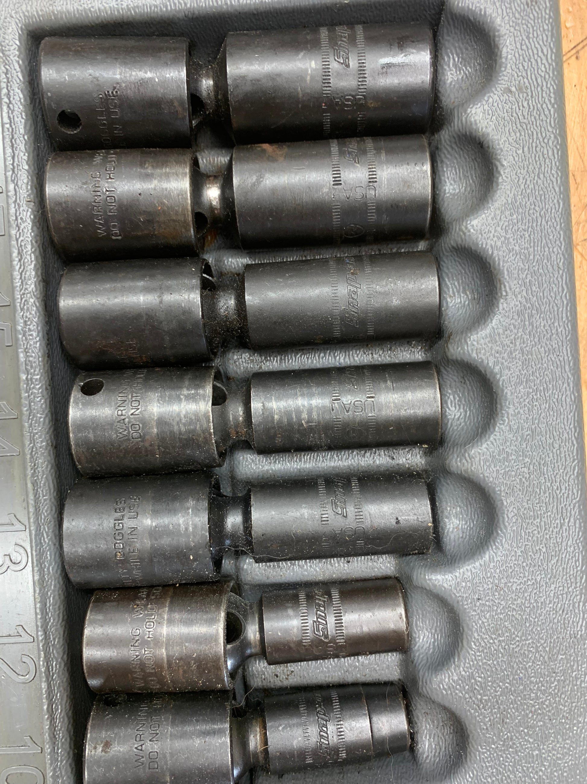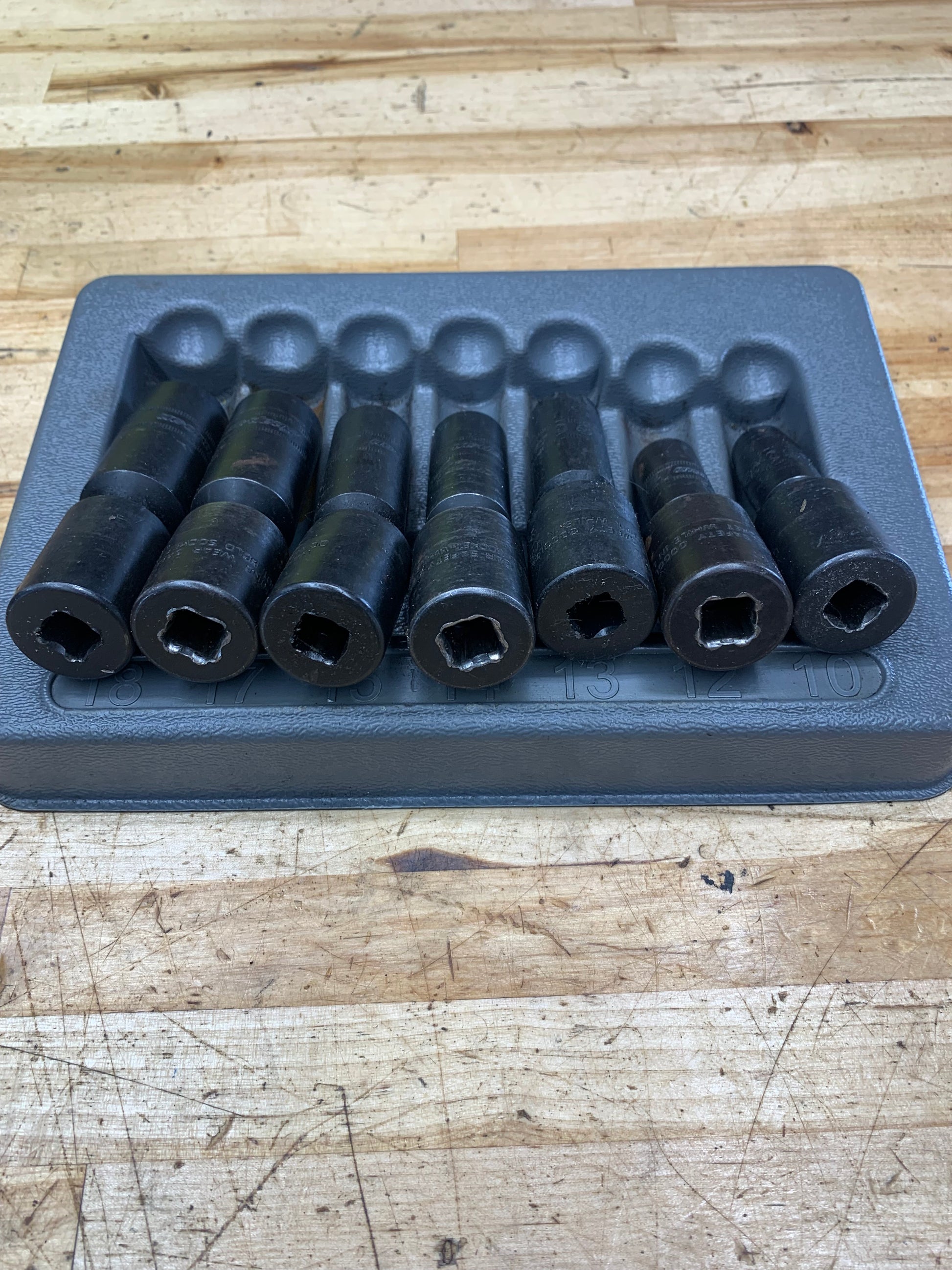 For sale is a 7pc set of Snap On 3/8” deep metric impact swivels, with tray. The sockets are in good used condition.
