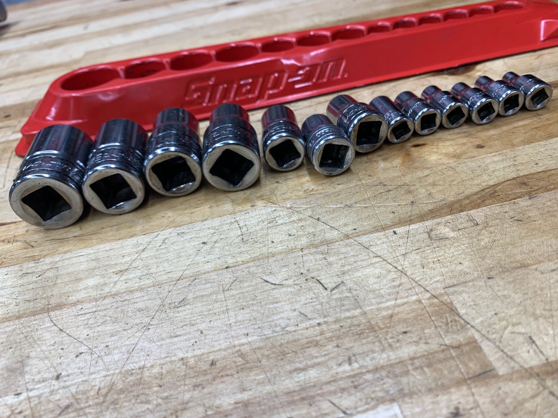 For sale is a 13pc set of ETorx snap on sockets. They are in good used condition. The E12 size was replaced with an older socket with the underline logo. All sockets are in good working order. Comes with magnetic tray.