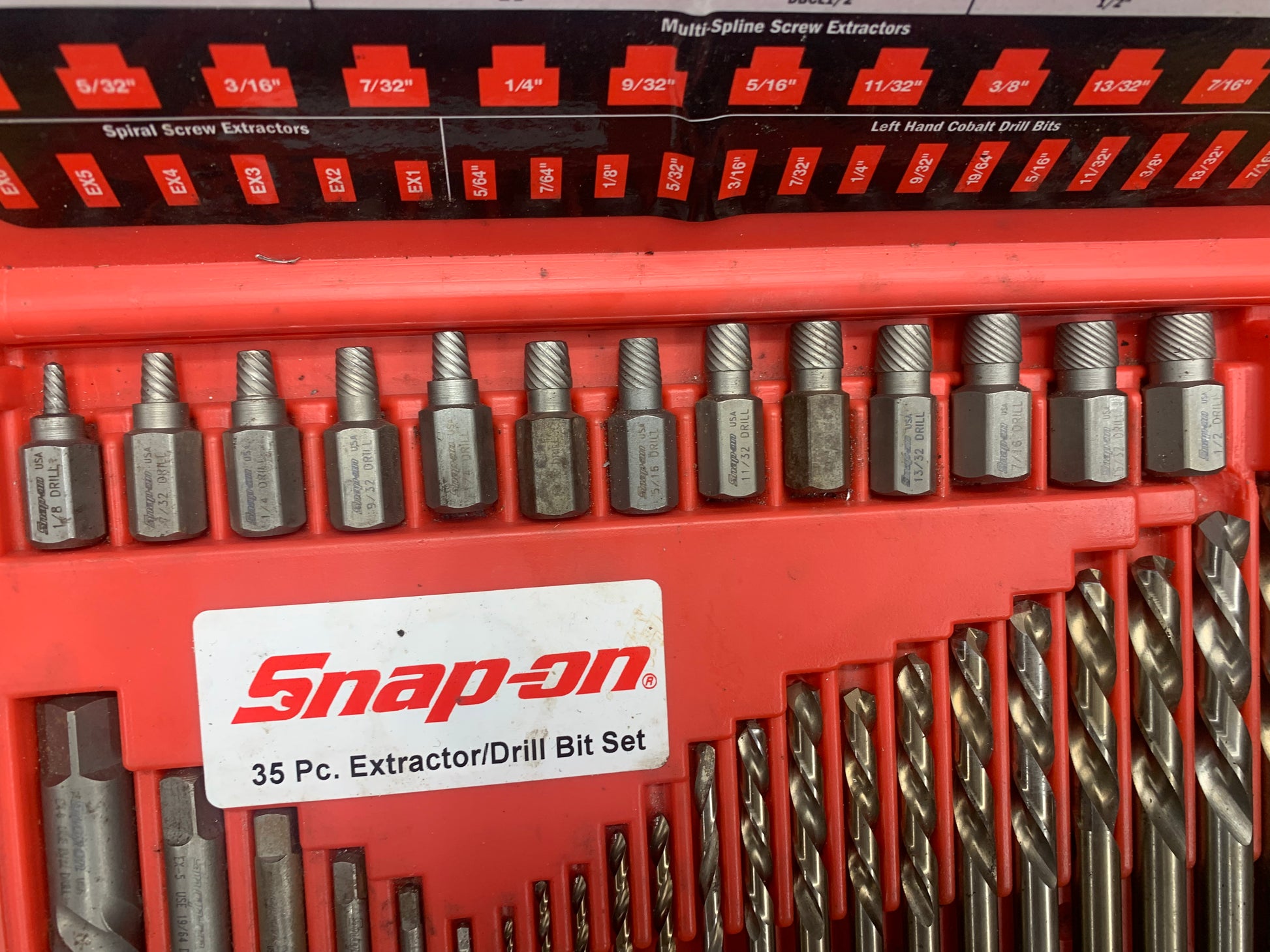 For sale is a Snap On master bolt extractor kit. This set is in good used condition, missing zero parts. A few of the cobalt bits have been replaced. The small EX2 flute extractor has a minor chip to the end of the extractor.