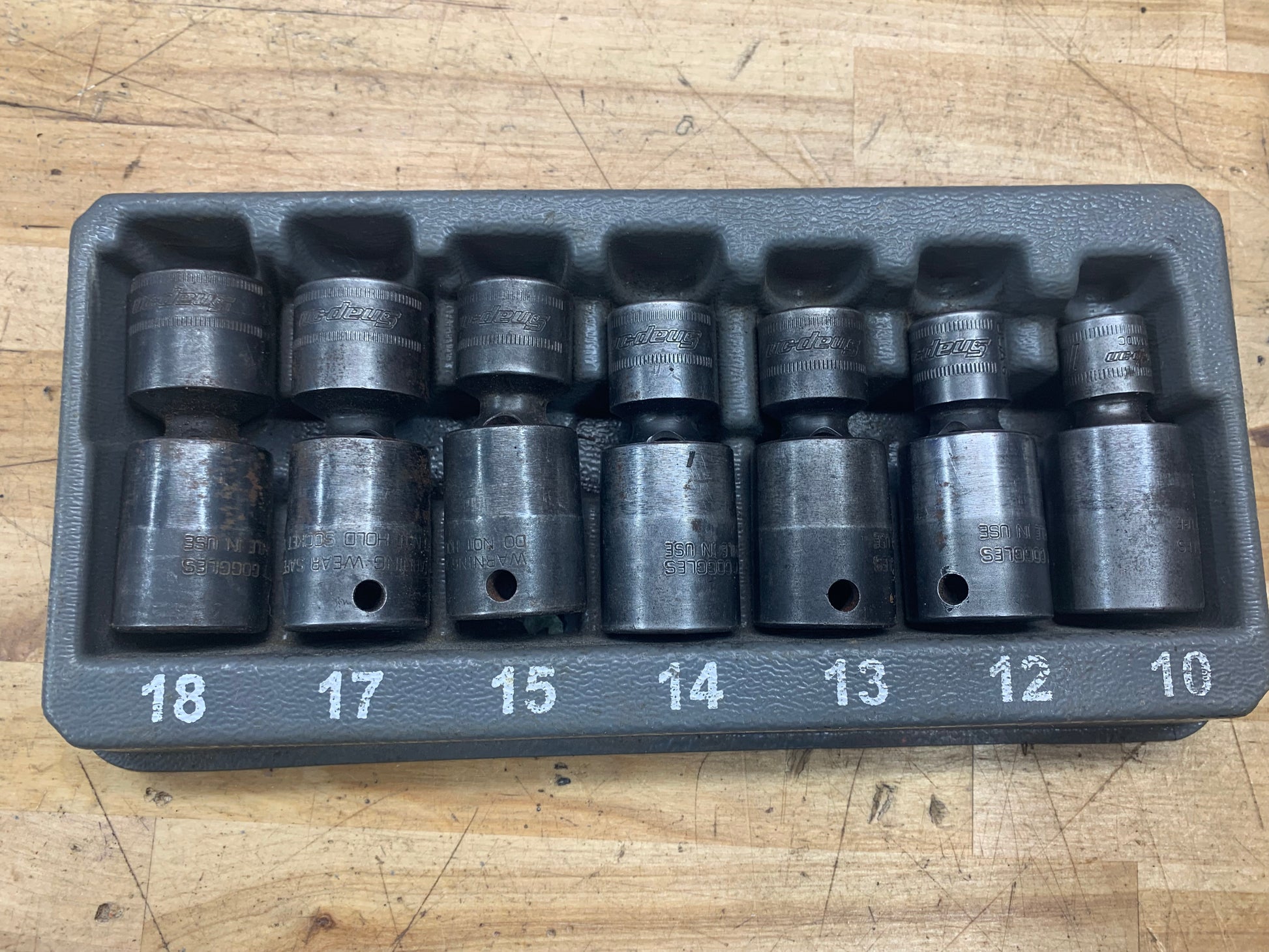 For sale is a set of Snap On 3/8” metric impact swivel sockets. They are in good used condition. Comes with tray, and all original sockets.