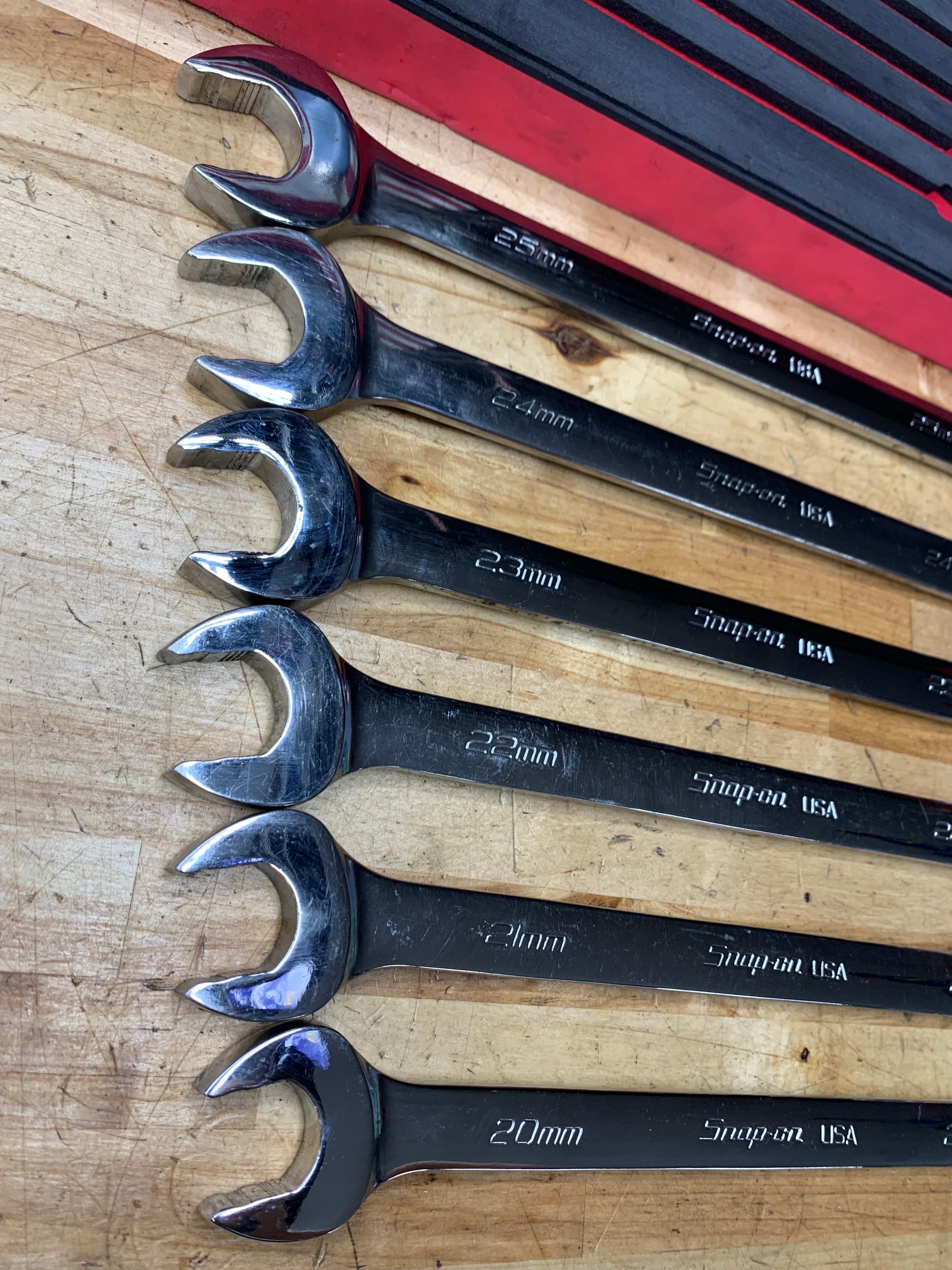 For sale is a metric set of Snap On Flank Drive Plus wrenches, sizes 20-25mm. The wrenches are in very good used condition. Comes with foam organizer.