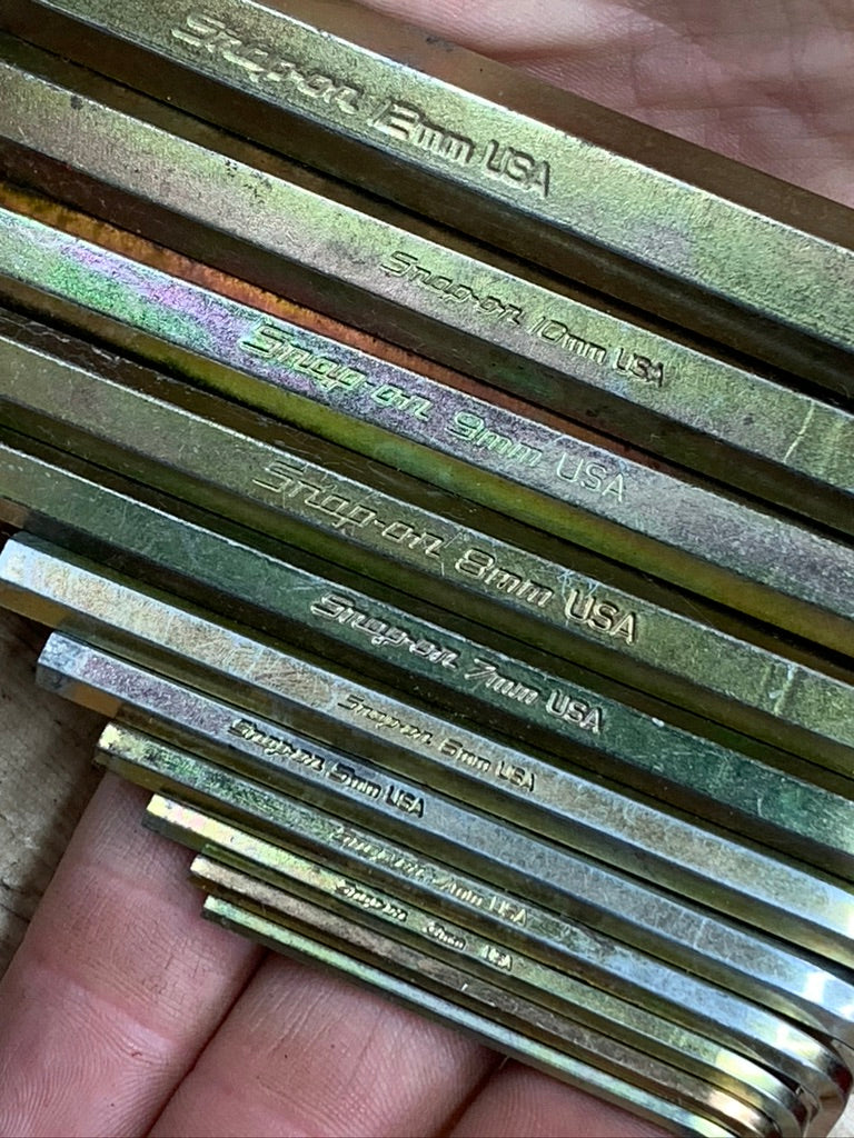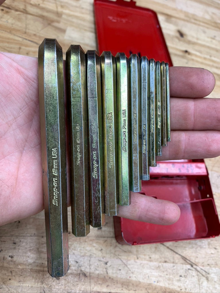 For sale is a Snap On metric hex key set, sizes 2-12mm. Most of the keys, and the metal index case have a small engraving. This set shows some signs of use, but the hex keys are not rounded, and still work great.