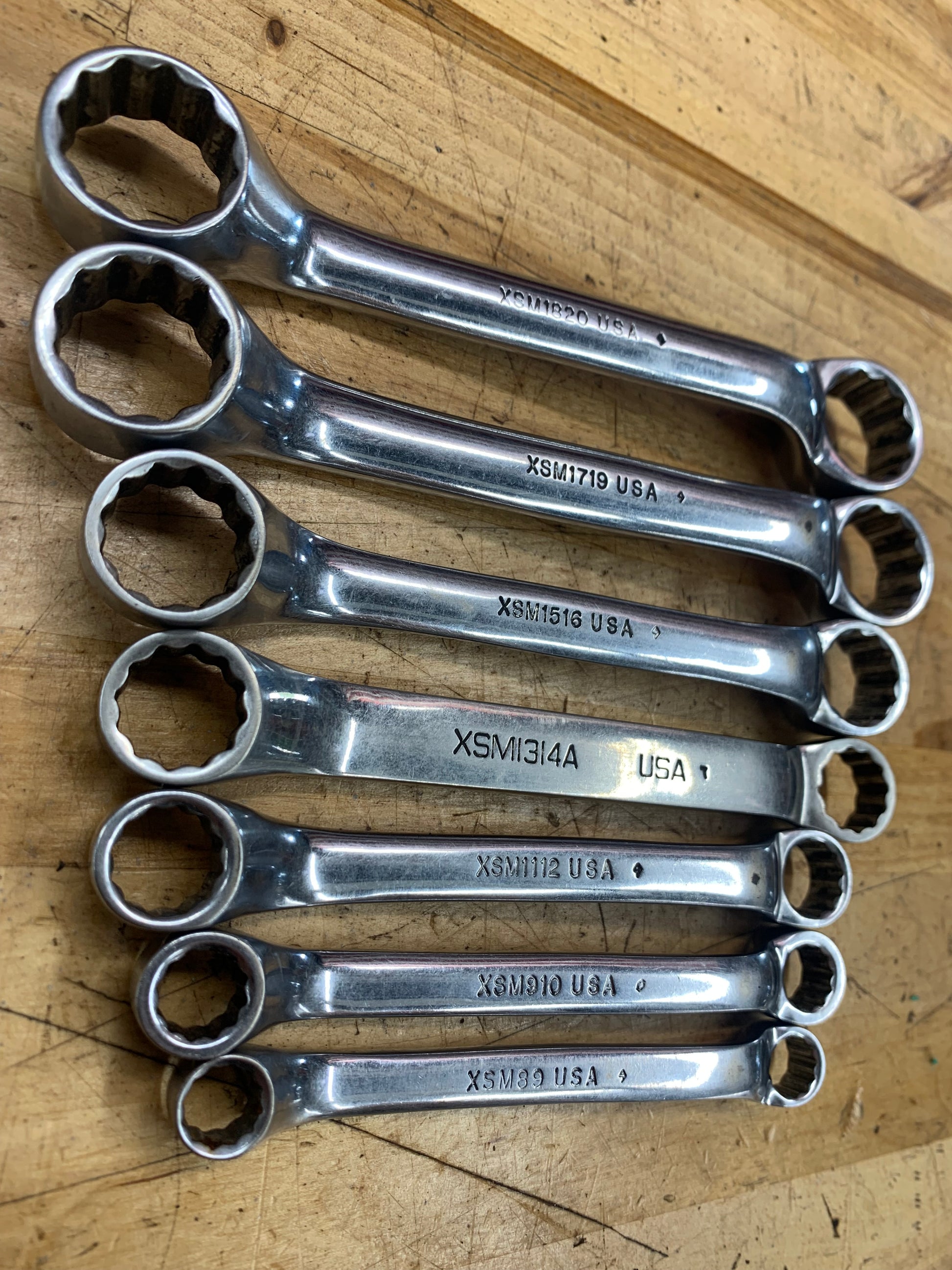 For sale is a 7 piece set of Snap On short pattern metric offset wrenches. One of the wrenches has the modern logo. The rest have the vintage underline logo. The tools are in good used condition.