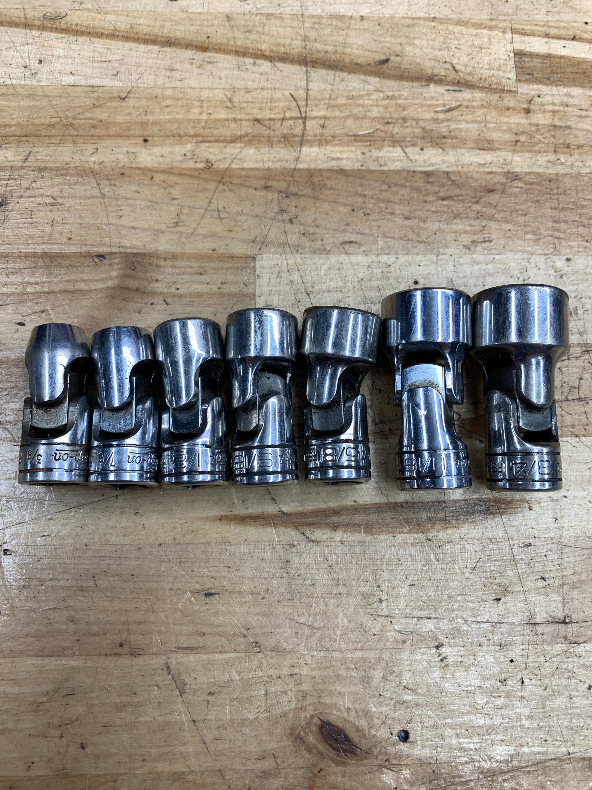 For sale is a 7pc SAE set of 3/8” Snap On swivel sockets. They are in good used condition. 3/8” thru 3/4”.