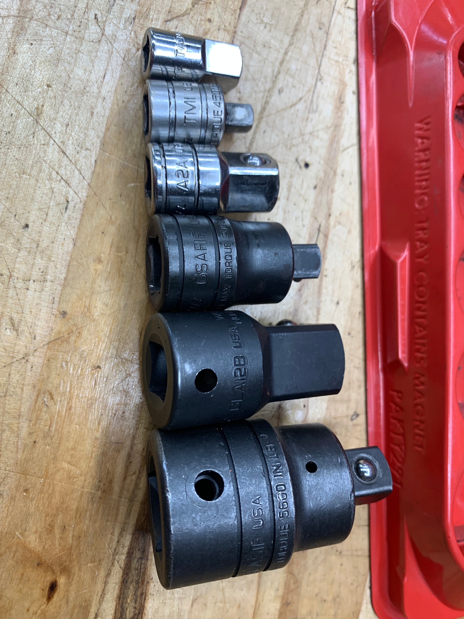 For sale is a 6pc. set of Snap On square drive adapters. The 3/8" female to 1/4" male was lost, and replaced with an older model Snap On tool. Comes with magnetic tray. ————————————————————-