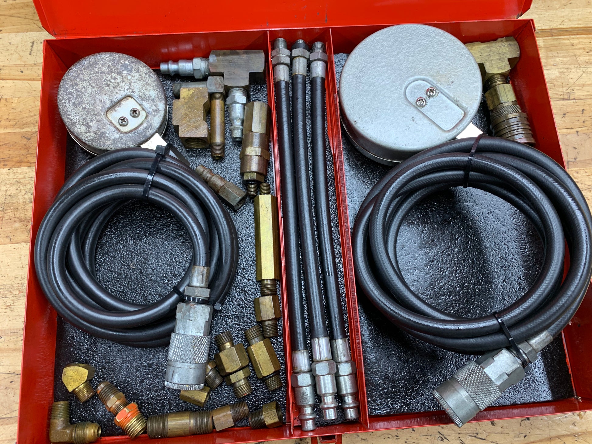For sale is a vintage Snap On transmission pressure gauge test set from 1977. Comes with both gauges, all 3 adapter hoses, and extra fitting adapters. The gauges hold pressure well. They have a bit of a patina, but still function perfectly. See video of operation in the picture section.