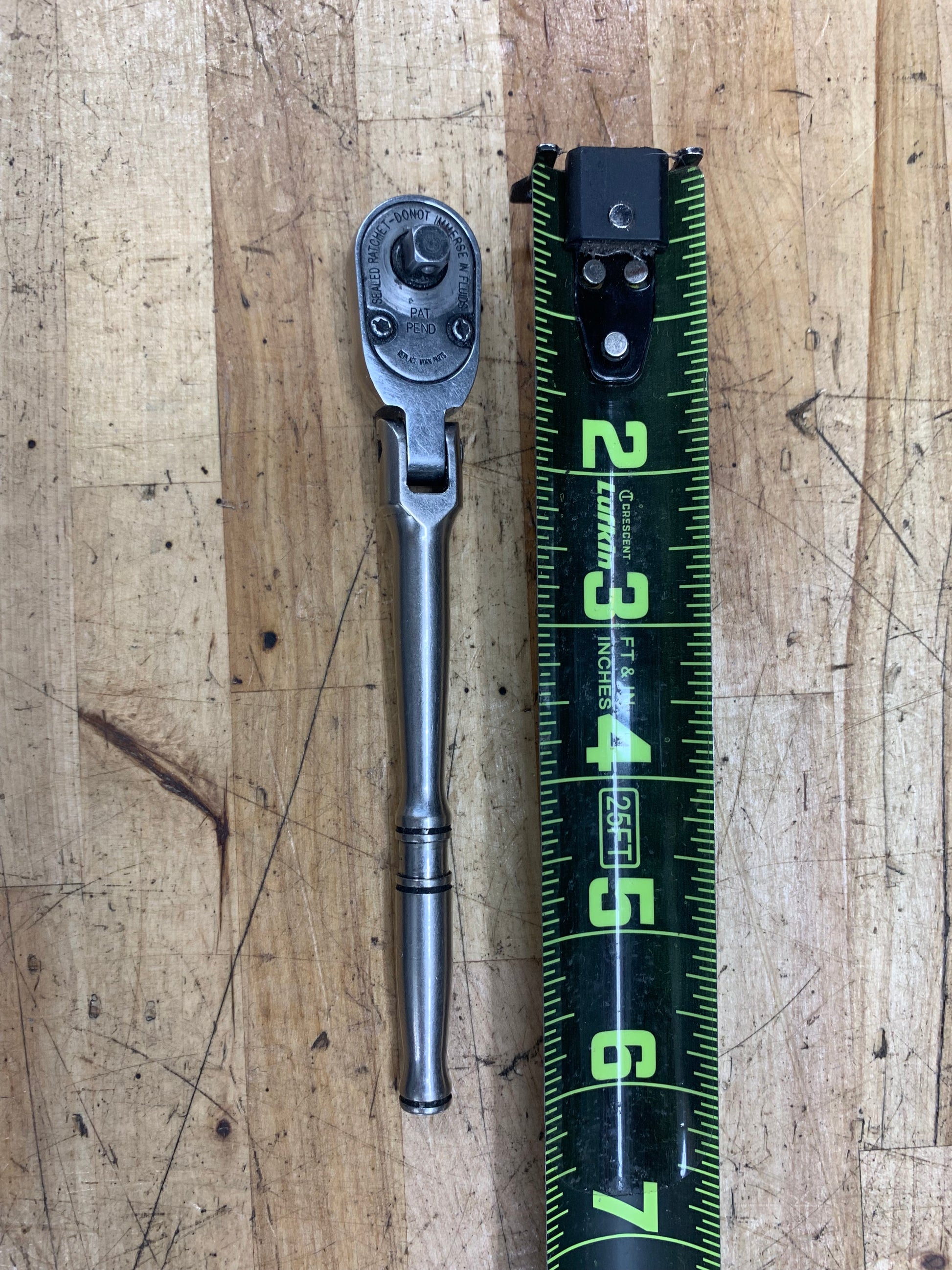 For sale is a 1/4" Snap On flex head ratchet. The tool shows some signs of wear, but is in good used condition. The ratchet mechanism works well, and the hinge is not floppy.
