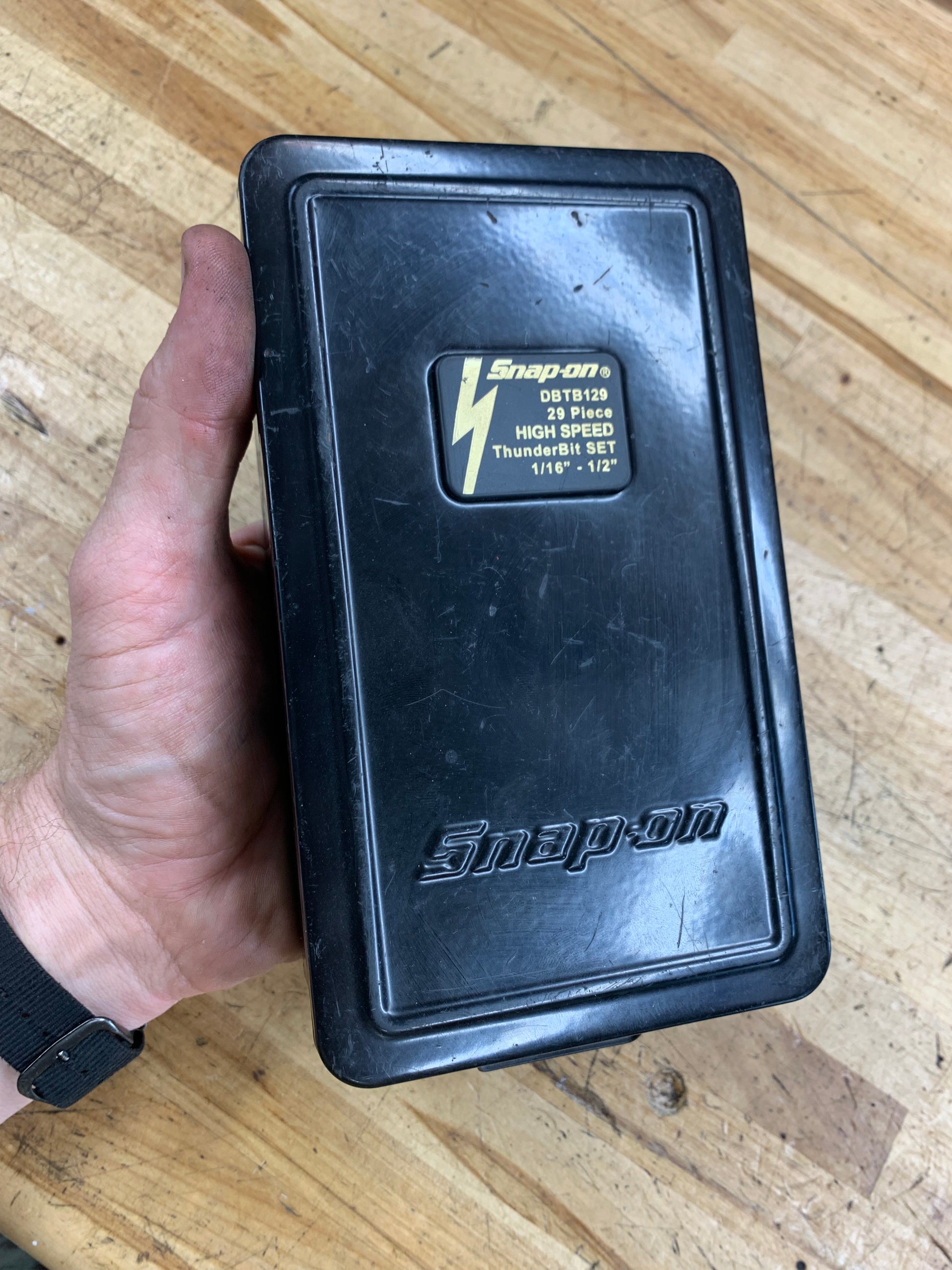 For sale is a Snap On HSS Thunderbit drill set 29pc. The drills are in good used condition, with sharp cutting edges. Two of the small bits were replaced with HSS bits. Several bits have chuck scratches on the shank, but nothing too major. All but two of the smaller bits are original.